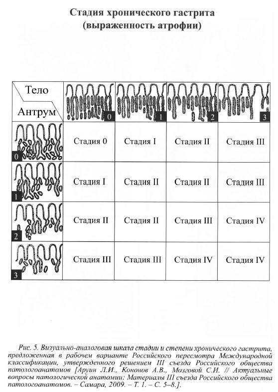 В предложенной классификации, утвержденной III съездом Российского общества патологоанатомов (Самара-2009), был совмещен принцип удобной визуально-аналоговой шкалы Модифицированной Сиднейской системы и табличный оценки степени и стадии хронического гастрита.
