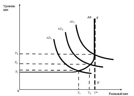 Расширение совокупного спроса в условиях приближения к полной занятости и при ее достижении вызывает рост общего уровня цен. Получается, что без инфляции нельзя добиться увеличения ВВП.