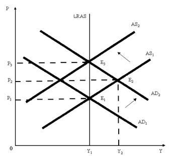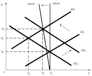 В долгосрочном плане избыточное расширение совокупного спроса приведет к новому долгосрочному равновесию, характеризующемуся неизменным объемом производства при возросшем уровне цен, что графически выразится в смещении равновесия вдоль кривой долгосрочного предложения LRAS из точки Е1