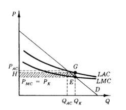 средние затраты оказываются выше предельных и применение принципа ценообразования по предельным затратам приводит к возникновению убытков L, равных площади прямоугольника PK