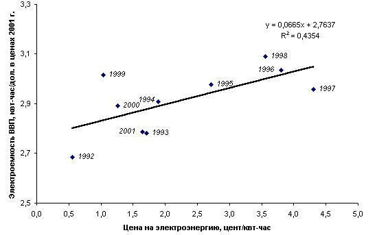 Рисунок 5 - Цена на электроэнергию и электроемкость ВВП в России в 1992-2001 годах