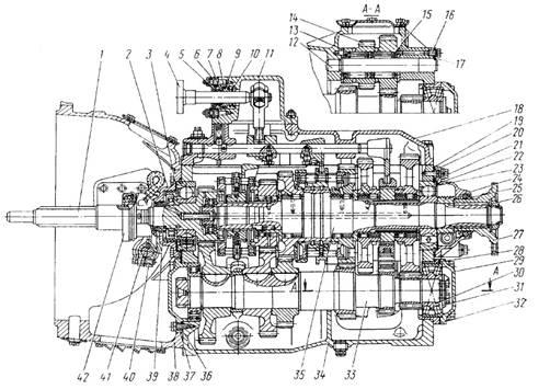 Рис. 1. Коробка передач модели 14: 1 - вал ведущий; 2 - крышка заднего подшипника ведущего вала; 3, 23 - прокладки регулировочные; 4 - шток рычага: 5 - кольцо защитное; 6 - крышка опоры рычага; 7 - сухарь опоры рычага; 8 - кольцо уплотнительное; 9 - опора штока; 10 - пружина; 11 - опора рычага переключения передач; 12 - ось блока шестерен заднего хода; 13, 31 - шайбы упорные; 14 –блок шестерен заднего хода; 15 - роликовый подшипник; 16 - болт со штифтом; 17 – шайба стопорная; 18 - крышка верхняя; 19, 32, 36 - прокладки уплотнительные; 20 - крышка заднего подшипника ведомого вала; 21 - кольцо стопорное; 22 - шариковый подшипник задний ведомого вала; 24 - червяк привода спидометра; 25, 39 - манжеты уплотнительные; 26 - гайка крепления фланца; 27 - фланец крепления карданного вала; 28 - стакан заднего подшипника промежуточного вала; 29 - крышка подшипника; 30 - роликовый подшипник сферический; 33 - вал промежуточный; 34 - картер коробки передач; 35 - вал ведомый; 37 - крышка переднего подшипника промежуточного вала; 38 - картер сцепления; 40 - вилка выключения сцепления; 41 - вал вилки выключения сцепления; 42 - муфта выключения сцепления.
