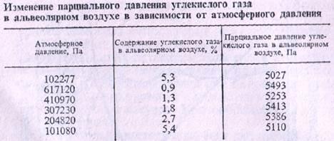 в альвеолярном воздухе остается относительно постоянным и при повышении и при понижении атмосферного давления в окружающей среде. Это имеет большое физиологическое значение, так как создает необходимое условие для нормальной возбудимости дыхательного центра и делает возможным дыхание на больших высотах. Постоянство парциального давления СО2