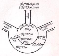 в альвеолярном воздухе (по сравнению с напряжением его в венозной крови) он переходит путем диффузии из крови легочных капилляров альвеолярный воздух. В результате более низкого парциального давления О2
