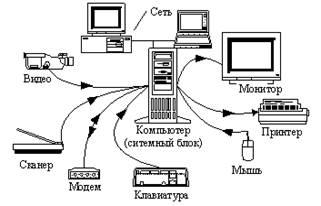 Компьютер обменивается информацией с внешним миром с помощью периферийных устройств. Только благодаря периферийным устройствам человек может взаимодействовать с компьютером, а также со всеми подключенными к нему устройствами. Любое подключенное периферийное устройство в каждый момент времени может быть или занято выполнением порученной ему работы или пребывать в ожидании нового задания. Влияние скорости работы периферийных устройств на эффективность работы с компьютером не меньше, чем скорость работы его центрального процессора. Скорость работы внешних устройств от быстродействия процессора не зависит. Наиболее распространенные периферийные устройства приведены на рисунке 1: