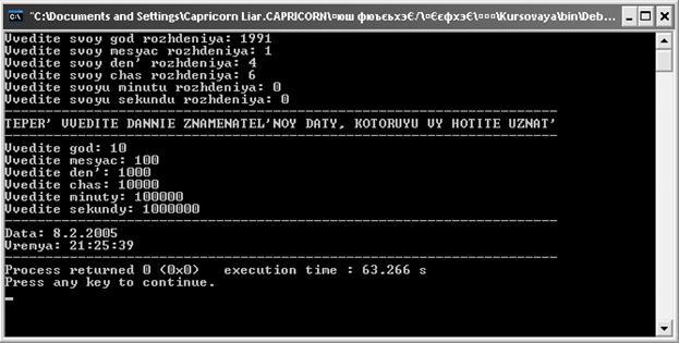 Ввод данных закончен. Теперь программа рассчитывает знаменательную дату, исходя из введенных пользователем данных и выводит дату и время на экран. Например: