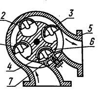 (рис. 7). Корпус 5 соединен с двумя патрубками для подвода и отвода измеряемой жидкости, расположенными под углом 90°. Внутри цилиндрической полости корпуса помещен ротор б с четырьмя полукруглыми пазами, в которых расположены четыре лопатки 1-4, выполненные в форме корытца. К торцам ротора крепятся две дисковые пластины с подшипниками для осей лопаток. Специальная система шестеренок, установленных между одной из торцовых пластин и задней крышкой камеры, обеспечивает неизменный наклон лопаток относительно горизонтальной оси счетчика.