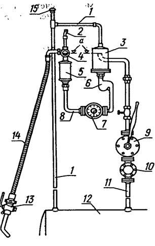 В качестве простого и наглядного примера рассмотрим установку и эксплуатацию .объемного счетчика на бензораздаточной колонке (рис.8 ). Бензин подается в прибор из подземного резервуара 12 насосом 9. Во всасывающей линии насоса установлены фильтр 10 и воздушный кран 77. Нагнетаемый насосом бензин протекает через газоотделитель 3, фильтр тонкой очистки б, бензосчетчик 7, смотровой сосуд 5 с указателем уровня 4 и воздушным клапаном 2 и подается в раздаточный шланг 14 с краном 13. Для слива бензина служит кран 8. Пары бензина возвращаются в приемный резервуар по трубопроводу 1.