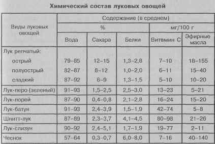 Химический состав луковых овощей зависит от сорта, места произрастания, условий и сроков хранения.