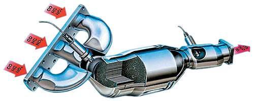 На современных автомобилях для снижения выбросов вредных веществ устанавливаются трехкомпонентные каталитические нейтрализаторы. Трехкомпонентными их называют потому, что они нейтрализуют три вредных составляющих выхлопных газов: СО, СН и NO. Трехкомпонентный каталитический нейтрализатор представляет собой корпус из нержавеющей стали, включенный в систему выпуска до глушителя. В корпусе располагается блок носителя с многочисленными продольными порами, покрытыми тончайшим слоем вещества катализатора, которое само не вступает в химические реакции, но одним своим присутствием ускоряет их течение. В качестве катализатора используется платина и палладий, которые способствуют окислению СО и СН, а родий ”борется” с NOx. В результате реакций в нейтрализаторе токсичные соединения CO, CH и NOx окисляются или восстанавливаются до углекислого газа СО2, азота N2 и воды Н2О.