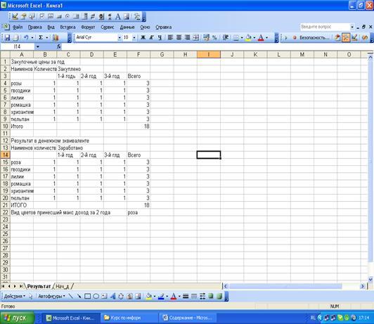 Sheets("Результат").Cells(22, 1) = "Вид цветов принесший макс доход за 2 года"
