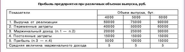 Для расчета воспользуемся данными предыдущего примера. В нашем случае цена безубыточности единицы изделия равна 9 руб.09 коп. (45445 : 5000 бут.). Зная формулу цены безубыточности, всегда можно установить необходимую цену реализации для получения определенной величины прибыли при реализации установленного объема производства.