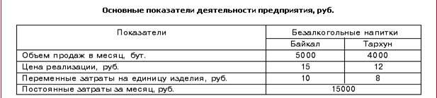 Как видно из таблицы, за месяц предприятие заработает 26000 руб. прибыли. Средняя величина маржинального дохода для напитка «Байкал» составляет 5 руб., а для напитка «Тархун» – 4 руб. Норма маржинального дохода для обоих напитков составляет 0,33.