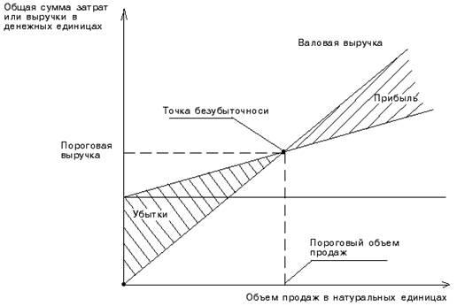 Изображенная на рис. 1 точка безубыточности (порога рентабельности) – это точка пересечения графиков валовой выручки и совокупных затрат. Размер прибыли или убытков заштрихован. В точке безубыточности получаемая предприятием выручка равна его совокупным затратам, при этом прибыль равна нулю. Выручка, соответствующая точке безубыточности, называется пороговой выручкой. Объем производства (продаж) в точке безубыточности называется пороговым объемом производства (продаж). Если предприятие продает продукции меньше порогового объема продаж, то оно терпит убытки, если больше – получает прибыль.