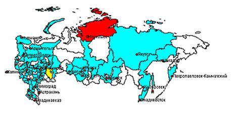 Рис. 7. Заболеваемость гриппа и ОРВИ в РФ на состояние 18.12.2006 г. - нет данных, - относительно стабильные уровни заболеваемости, - рост заболеваемости, - эпидемия, продолжающийся рост заболеваемости, - эпидемия, заболеваемость идет на спад, - снижение заболеваемости (Бугаев В., 2006).