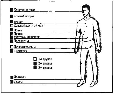 При сравнительно равномерном облучении организма ущерб здоровью определяют по уровню облучения всего тела, что соответствует первой группе критических органов. К ней относят также половые органы и красный костный мозг. Во вторую группу критических органов входят мышцы, щитовидная железа, жировая ткань, печень, почки, селезенка, желудочно-кишечный тракт, легкие, хрусталики глаз. Третью группу критических органов составляют кожный покров, костная ткань, кисти рук, предплечья, голени и стопы.