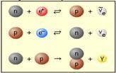 Когда период сжатия подходит к концу и внутри звезды начинают протекать температурные реакции, все звезды оказываются на главной последовательности диаграммы спектр — светимость. В термоядерной реакции водород превращается в гелий. При этом четыре протона (четыре ядра атома водорода) образуют ядро атома гелия. Получившийся излишек массы превращается в энергию: примерно 0,007 массы вещества при этой реакции превращается в энергию излучения.