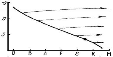 Таким образом, первый период образования звезды — это период сжатия. Он длится до того момента, пока в центральной области звезды не начнут протекать термоядерные реакции. В продолжение периода сжатия температура звезды повышается. Поэтому спектральный класс звезды становится более ранним. Что же касается светимости звезды, то в период сжатия ее увеличению будут способствовать увеличение температуры поверхности, а также увеличение прозрачности разогревшегося вещества. Поэтому из звезды будет непосредственно выходить излучение более глубоких и горячих слоев. Но работает и обратный механизм. Уменьшение радиуса звезды будет уменьшать светимость. Специалисты оценили совокупное действие всех механизмов и пришли к заключению, что в период сжатия звезды все же происходит небольшое увеличение светимости звезды. Именно поэтому на диаграмме спектр — светимость эволюция в период сжатия протекает вдоль линий, которые проходят справа налево и немного поднимаются вверх. Это показано на рисунке 17. Различие линий эволюции на диаграмме определяется различием масс газовых облаков, из которых образовались звезды. Чем больше масса, тем больше светимость, тем выше на диаграмме проходит линия эволюции.