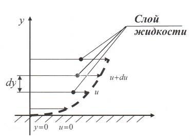 На рисунке применены следующие обозначения: – скорость слоя жидкости, – расстояние между соседними слоями жидкости. Медленно движущийся слой жидкости «тормозит» соседний слой жидкости, движущийся быстрее, и наоборот, слой, движущийся с большей скоростью, увлекает (тянет) за собой слой, движущийся с меньшей скоростью. Силы внутреннего трения появляются вследствие наличия межмолекулярных связей между движущимися слоями.