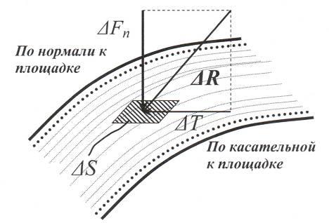 В общем случае поверхностная сила , действующая на площадке под некоторым углом к ней, может быть разложена на нормальную и тангенциальную составляющие.