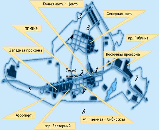 Если говорить о самом городе, то можно выделить 2 основные промышленные зоны: Восточная и Западная. Западная промзона – довольно старый и хорошо обжитый район, и сейчас наблюдается отток разного вида производств в Восточную, особенно на север. По-прежнему, неоспоримо важную роль играет расположенный на западе района в микрорайоне Заозерном трест «Уренгойремгаз». Это единственное предприятие в данном районе, которое не теряет своей значимости и по сей день. Оно занимается строительством административных и производственных зданий, обеспечивает работу таким организациям, как совхоз, база ПТОИК[6]