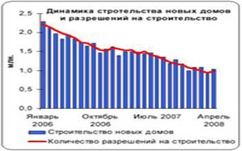 Крупнейший за последние годы кризис в финансовой сфере отразился почти на всех развитых странах, наиболее пострадали США, где цены на недвижимость до сих пор не показывают признаки роста (см.рис. 1), а темпы строительства новых домов серьезно сократились (см.рис. 2). Американский фондовый рынок, особенно в лице финансового и строительного секторов, испытал негативное влияние кризиса. Он падал почти всю вторую половину 2007 года. Российскому фондовому рынку, сохраняющему сильную корреляцию с рынком США, удалось удержаться от масштабного падения в прошлом году, но в начале этого года котировки отечественных акций упали гораздо сильнее, чем мировые, что можно объяснить запоздалой реакцией на трудности в американской экономике.