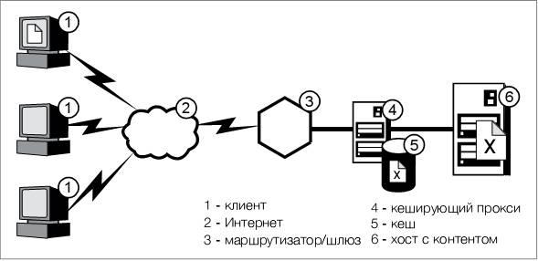 В большинстве случаев пересылающие прокси конфигурируются также для работы в качестве кэширующих прокси. Это явление используется настолько часто, что компания IBM включила это в название компонента своего Edge Server: IBM Caching Proxy. На рис. 1 отображен типичный пересылающий и кэширующий прокси-сервер.