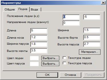 Рис. 3.8 Для задания параметров сцены используется диалог представленный на рис. 3.8, который содержит три вкладки: «Общие», «Лодка», «Вода». Они предназначены для задания общих параметров сцены, для задания параметров лодки, и для задания параметров водной поверхности соответственно.