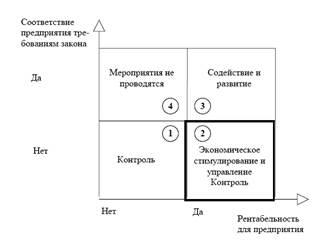 Соотношение между методом контроля, с одной стороны, и соответствием объекта контроля требованиям закона и выгодностью мероприятия для предприятия, с другой стороны, можно изобразить в виде поля, разделённого на четыре части (рис. 1.1). Таким образом, инспектору тоже приходится играть различные роли в различных ситуациях. С точки зрения использования экономического подхода наибольший интерес на рисунке 1.1 представляет поле 2.