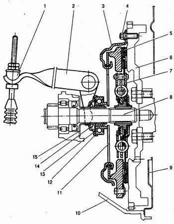 Рис. 1. Сцепление в сборе: 1 - поводок троса; 2 - вилка выключения сцепления; 3 - кожух сцепления; 4 - болт крепления сцепления к маховику; 5 - нажимной диск; 6 - маховик; 7 - ведомый диск; 8 - первичный вал коробки передач; 9 - нижняя крышка картера сцепления; 10 - картер сцепления; 11 - нажимная пружина; 12 - подшипник выключения сцепления; 13 - фланец муфты подшипника; 14 - втулка муфты подшипника; 15 - направляющая втулка