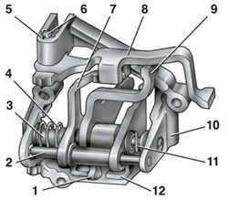 В корпусе 10 (рис. 5) механизма выбора передач крепятся две оси. На оси 3 установлены трехплечий рычаг выбора передач, две блокировочные скобы 7 и 12. Другая ось 2 проходит через отверстия блокировочных скоб, фиксируя их от проворачивания. Плечо рычага 1 выбора передач служит для включения передач переднего хода, плечо рычага 9 – для включения заднего хода, а на третье плечо действует рычаг штока выбора передач. На оси 6 установлена вилка 8 включения заднего хода.
