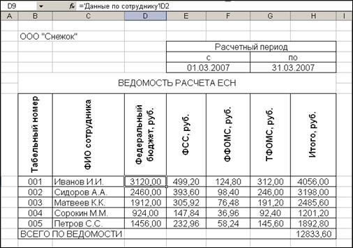 3. Организовать межтабличные связи для автоматического формирования ведомости расчета ЕСН (единого социального налога
