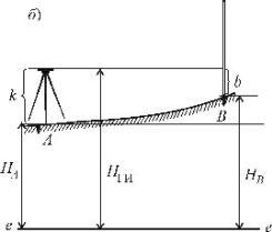 В строительстве отсчет высоты ведут от условной нулевой отметки — уровня пола первого этажа. Нулевая отметка по проекту должна иметь абсолютную отметку (т. е. от уровня моря). Допустим, что уровень нулевой отметки нужно закрепить на обноске (рис. 115, а). Абсолютная от метка нулевой точки по проекту равна 102,285, а отметка репера — 104,012. Следовательно, уровень нулевой отметки ниже уровня репера на 1,727 м. Чтобы перенести нулевую отметку на столб 4 обноски, между ним и репером устанавливают нивелир 3, на репер ставят рейку 2 и делают отсчет. Предположим, что отсчет по рейке равен 525 мм. Тогда отметка горизонта инструмента будет 104,012+0,525 = 104,537 м. За тем вычисляют разность между отметкой горизонта инструмента и абсолютной отметкой нулевой точки: 104,537—102,285 = 2,252 м. Эту разность должен дать отсчет по рейке, установленной на нулевой отметке. Визируя на рейку, ее устанавливают у столба обноски таким образом, чтобы отсчет по рейке был 2252 мм. Получив этот отсчет, по нижнему концу рейки на столбе обноски прочерчивают линию, которая служит уровнем нулевой отметки. Для закрепления этого уровня на столбе обноски забивают штырь или гвоздь.