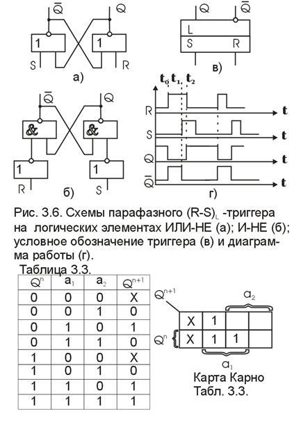 RS-тиna на элементах И-НЕ (а), И-ИЛИ-НЕ (б), условное обозначение триггера (в) и диаграмма работы (г). |