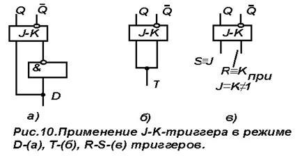 | Рис. 7 Применение J-K-триггера в режиме D-(a), T-(б), R-S-(в) триггеров |