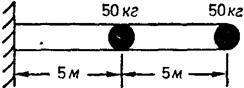 Задача 4. [12, стор. 71] Консольний брус довжиною 10 м, що має згинну жорсткість і погону масу 10 кг/м, апроксимується двома точковими масами по 50 кг кожна, що розташовані в центрі та на вільному кінці бруса.