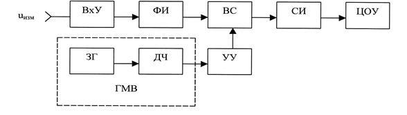 ВхУ – входное устройство, ФИ – формирователь импульсов, ВС – временной селектор, СИ – счётчик импульсов, ЦОУ – цифровое отсчётное устройство, ЗГ – задающий генератор, ДЧ – делитель частоты, ГМВ – генератор меток времени, УУ – устройство управления.