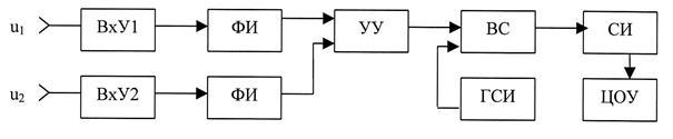 Исследуемые сигналы в виде напряжений и (одинаковой частоты) через входные устройства ВхУ1 и ВхУ2 поступают на формирователи импульсов ФИ, назначение которых – преобразовать входные сигналы в последовательности коротких импульсов в определённые моменты времени. Сформированные импульсы поступают на вход УУ, на выходе которого формируются импульсы длительностью , по форме близкие к прямоугольным; эти импульсы поступают на один вход временного селектора ВС, на другой вход поступает сигнал с выхода генератора счётных импульсов ГСИ; счётчик СИ подсчитывает количество импульсов, прошедших через ВС за время .