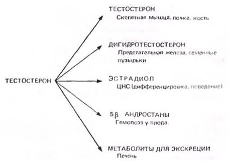 В андроген-зависимых тканях тестостерон главным образом действует в виде своего 5а-восстановленного производного - ДГТ. У здоровых особей мужского пола концентрация ДГТ в крови достаточно низкая: он образуется из циркулирующего тестостерона прямо в чувствительных клетках. При испытании на андрогенную активность (увеличение массы предстательной железы или семенных пузырьков) у кастрированных самцов крыс ДГТ оказался вдвое активнее тестостерона. Он обладает и большим сродством к глобулину, связывающему стероидные гормоны. Роль ДГТ в развитии мужской половой системы уже упоминалась. Все эти факты служат примером активации гормона тканями-мишенями.