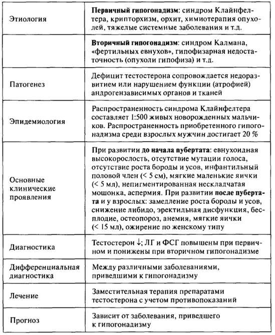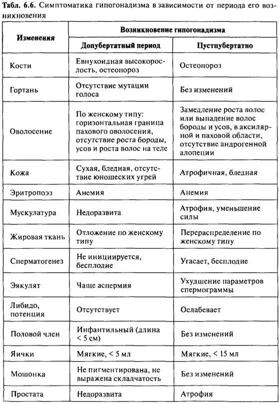 Гипогонадизм у мужчин - патологическое состояние, обусловленное уменьшением уровня андрогенов или снижением чувствительности к ним, которое может приводить к недоразвитию вторичных половых признаков или бесплодию. Выделяют первичный гипогонадизм, вызванный нарушением функции самих половых желез, и вторичный, возникший в результате снижения секреции гонадотропинов. Первичный гипогонадизм сопровождается гиперсекрецией гонадотропных гормонов и называется гипергонадотропным гопогонадизмом. При вторичном имеет место снижение секреции гонадотропинов - гипогонадотропный гипогонадизм. Реже встречается нормогонадотропный гипогонадизм, который характеризуется низкой продукцией тестостерона при нормальном уровне гонадотропинов. Кроме того, гипогонадизм может быть приобретенным и врожденным.