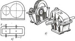 Рис. 1. Одноступенчатый горизонтальный редуктор с цилиндрическими зубчатыми колесами; а — кинематическая схема; б — общий вид редуктора с косозубыми колесами