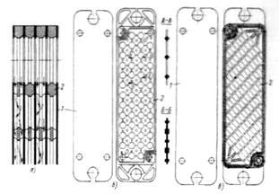 Каждая пластина имеет прокладки двух назначений: а) большая резиновая кольцевая прокладка, ограничивающая на лицевой стороне пластины канал для соответствующего потока рабочей среды и охватывающая также два угловых отверстия (с одной стороны пластины или по диагонали), через которые происходит приток среды в межпластинный канал и сток из него; б) две малые резиновые прокладки, изолирующие два остальных отверстия и создающие транзитный проход для второй рабочей среды.