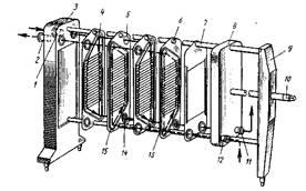 Аппарат состоит из группы теплообменных пластин 15, подвешенных па верхней горизонтальной штанге 7. Концы верхней и нижней штанг закреплены в неподвижной плите (передней стойке) 3 и на задней стойке. При помощи нажимной плиты 8 и винта 10 пластины в собранном состоянии сжаты в один пакет. На схеме для более ясного изображения потоков рабочих сред показано только пять пластин в раздвинутом положении. В рабочем положении пластины плотно прижаты друг к другу на резиновых прокладках 13 и 5.