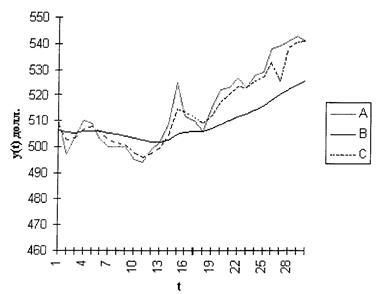 Рисунок 1.2. Экспоненциальное сглаживание временного ряда курса акций: А – фактические данные; В – экспоненциальная средняя при альфа = 0,1; С – экспоненциальная средняя при альфа = 0,5