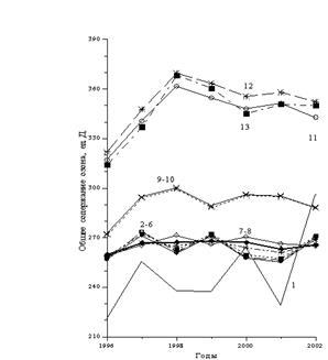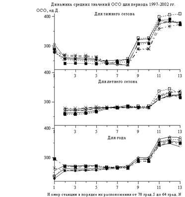 Минимальное значение ОСО (110 ед.Д.) за период 7.1996 г. - 12.2002 г. наблюдалось на ст. Восток 24 сентября 2001 г., а максимальное 559 ед.Д. - на ст. Тура 21 марта 2002 г. Следует отметить, что практически для всех станций и минимальные, и максимальные значения ОСО в 2002 г. возросли, причем на некоторых весьма существенно (на станциях Восток и Великьюэн в этом году максимальное значение ОСО увеличилось на 110 ед.Д. по сравнению со значением в 2001 г., а на ст. Восток и максимальное, и минимальное за 2002 г. значения были самыми высокими за все рассматриваемые годы, начиная с 1996 г.).