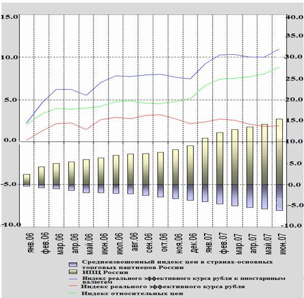 Динамика номинального эффективного курса рубля в отчетном периоде имела слабовосходящую динамику, отражающую как взаимокомпенсирующее влияние курсов валют основных торговых партнеров России на международном рынке, так и постепенное укрепление обменного курса рубля вследствие сохраняющегося объемного притока валютных ресурсов на внутренний рынок. Так в июне 2007 г. по отношению к декабрю 2005 г. индекс курсов основных торговых партнеров России к доллару США вырос на 8,3%, отражая общемировую тенденцию ослабления доллара США. Индекс номинального эффективного курса рубля при этом в отчетном периоде вырос на 1,9%, т.е. динамика рубля в целом соответствовала ситуации на международном валютном рынке с неярко выраженной тенденцией к укреплению.