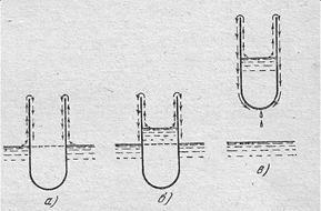Если погрузить в жидкий Не ІІ пустую пробирку так, как это показано на рис 10,а, то на наружной стенке пробирки образуется пленка жидкости. Двигаясь вверх по стенке, она проникает внутрь пробирки, и в конце концов жидкость наполняет пробирку, так что уровни жидкости в пробирке и в сосуде, в который она погружена, оказывается одинаковыми. Рис. 10