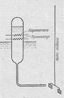 При пропускании тока через нагреватель и нагреве жидкости наблюдается поворот крылышка вместе с нитью подвеса. Это означает, что оно испытывает действие силы, которая может исходить только от струи жидкости, выходящей из трубки. Струя эта состоит, рис. 15