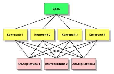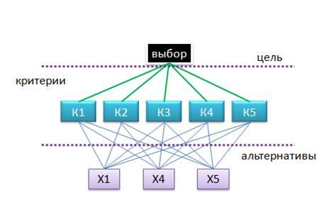 1) построения качественной модели проблемы в виде иерархии, включающей цель, альтернативные варианты достижения цели и критерии для оценки качества альтернатив (рисунок 1);