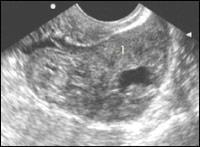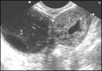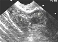 | Эхокартина внематочной беременности Обращает внимание выраженное утолщение стенок трубы (1) вокруг плодовместилища.